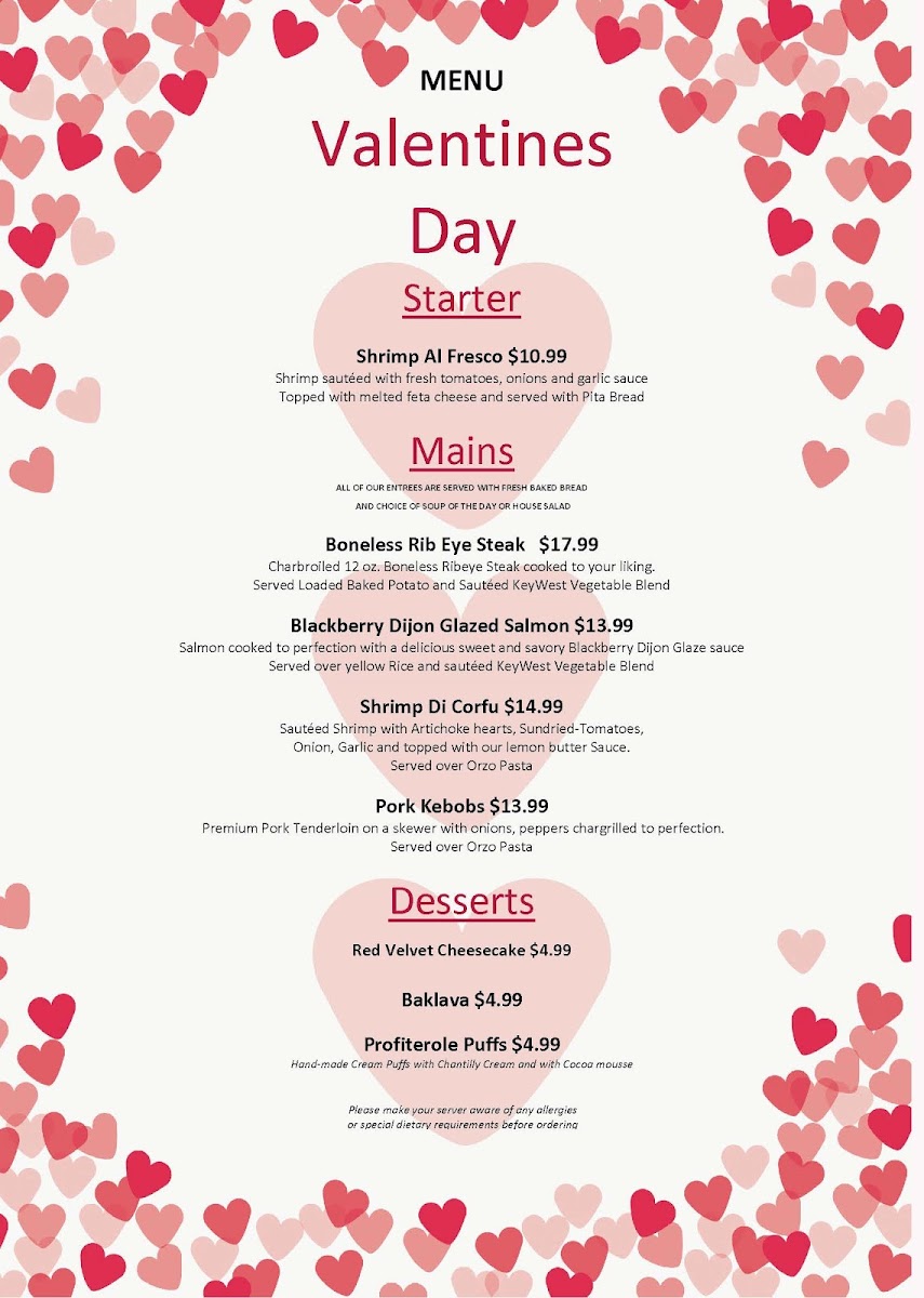 Succulent shrimp in a rich tomato sauce with garlic, onions, herbs, green peppers , and crumbled feta, served with warm pita bread.